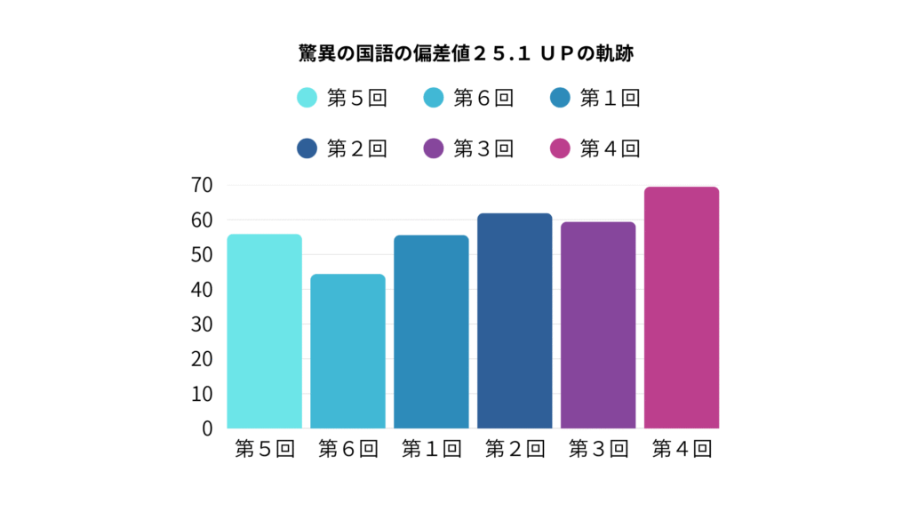 国語の偏差値44.4→69.5(下の馬渕教室の模試の成績票ご参照)
